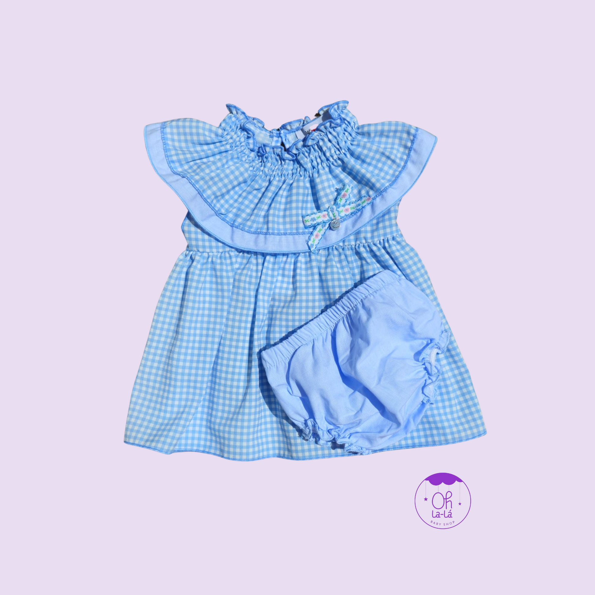 Jesusito fresquito en vichy azul con lazo de flores y braguita a juego. Ideal para paseos de verano y días especiales.
