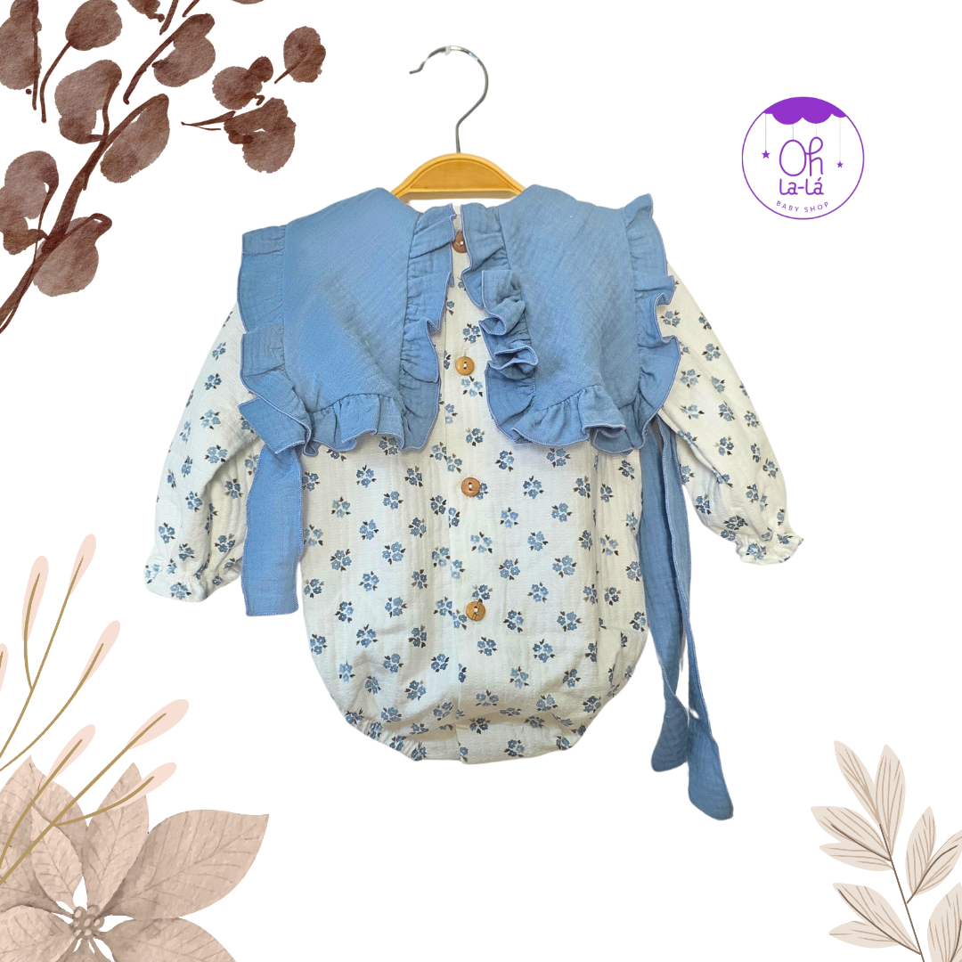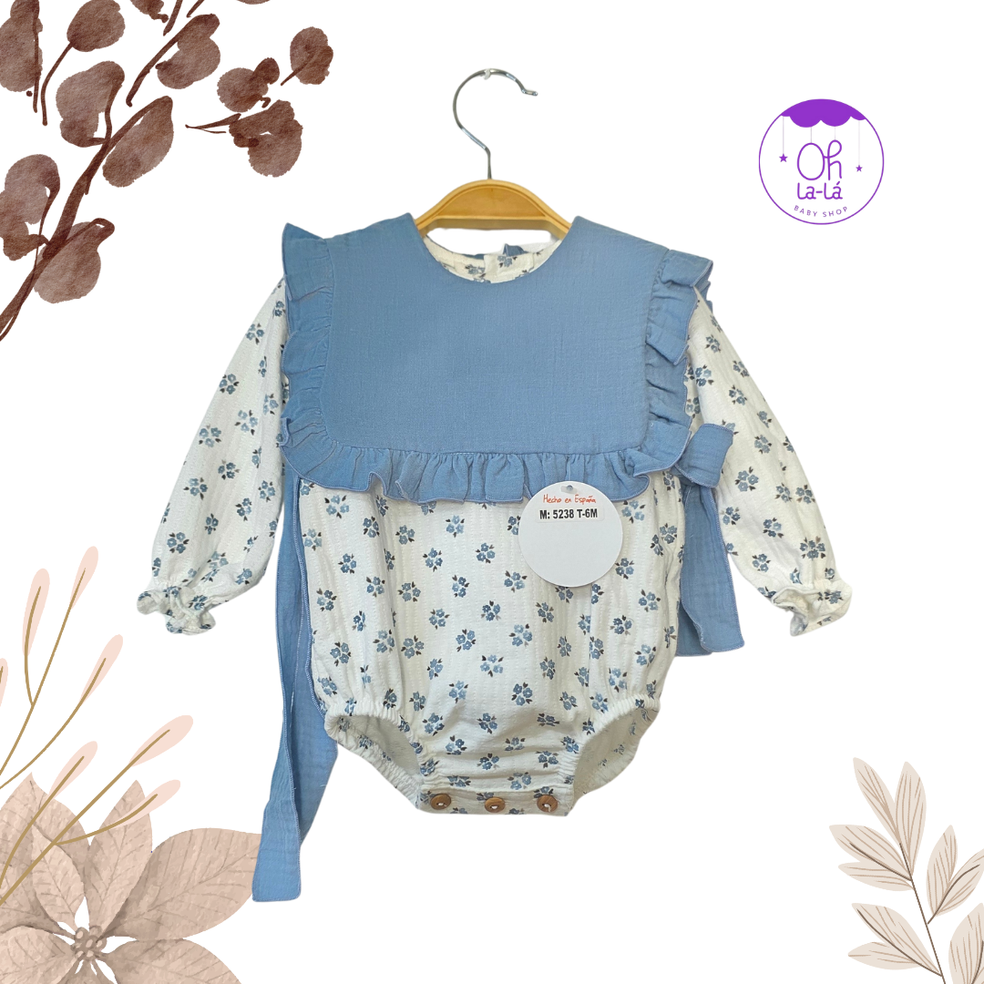 Pelele de manga larga en un encantador estampado floral azul. Destaca su baberola de lino con volantes en tono azul a juego, que se ajusta con una delicada lazada. Fabricado en España, este pelele es una opción cómoda y adorable para tu bebé. Las tallas disponibles van desde los 3 hasta los 24 meses.