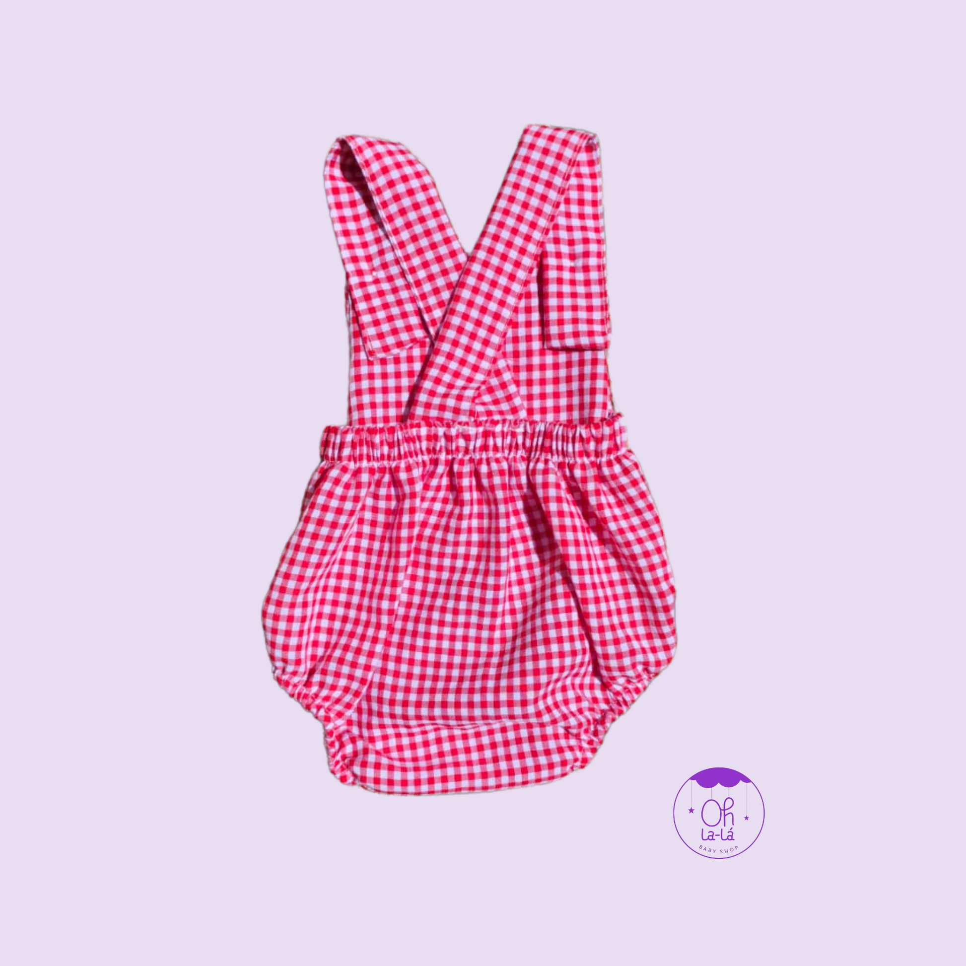 Ranita de bebé unisex en tejido vichy rojo con tirantes ajustables y cierre abotonado en la entrepierna para mayor comodidad. Diseño clásico, fresco y funcional, ideal para primavera y verano.
