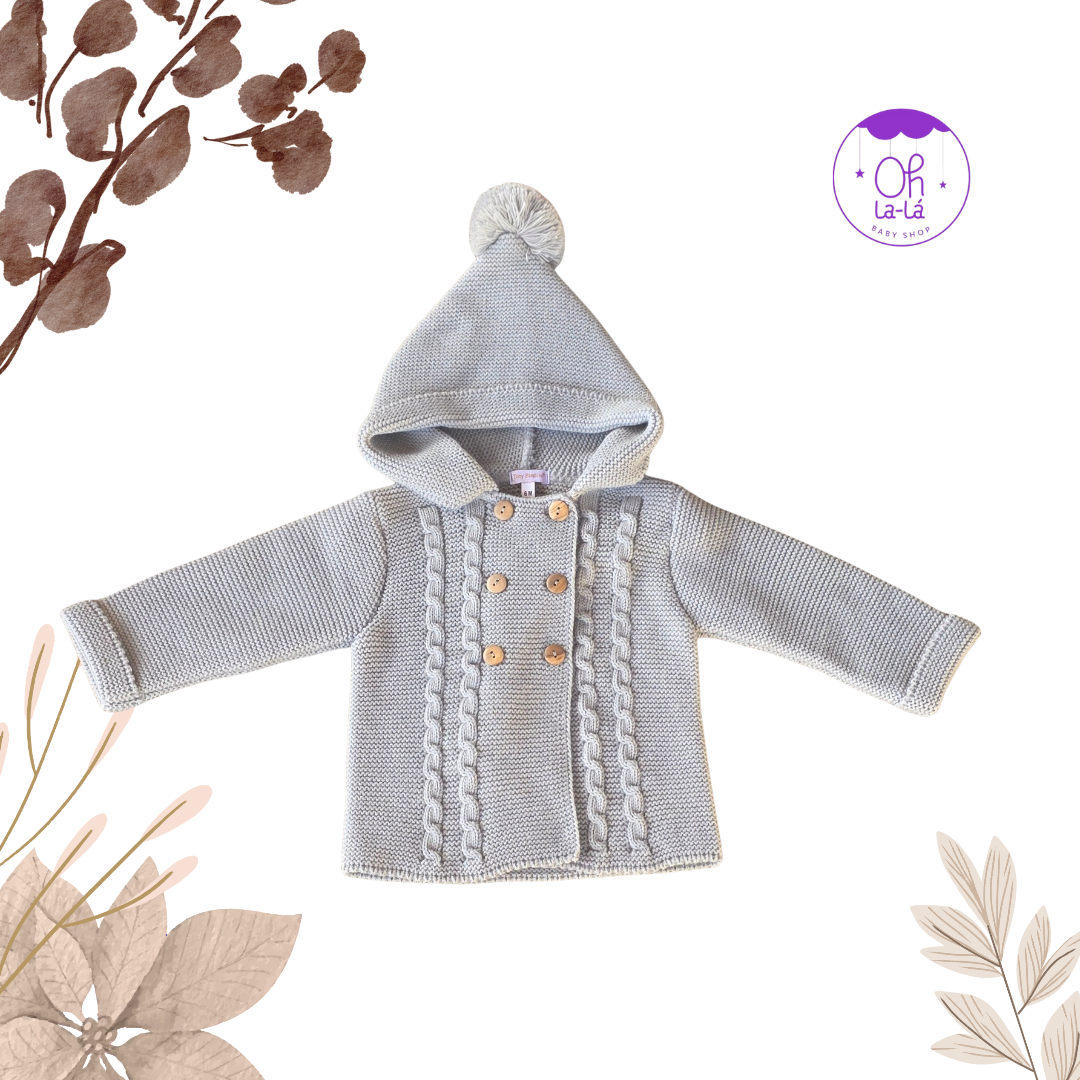 Preciosa trenca de fabricación nacional de la marca Tony Bambino. Confeccionada en lana, presenta un bonito diseño con trenzas y botones de madera en la parte delantera. Su capucha con un pompón a juego le da un toque tierno y adorable. Una prenda perfecta para abrigar a tu bebé en los meses de frío.