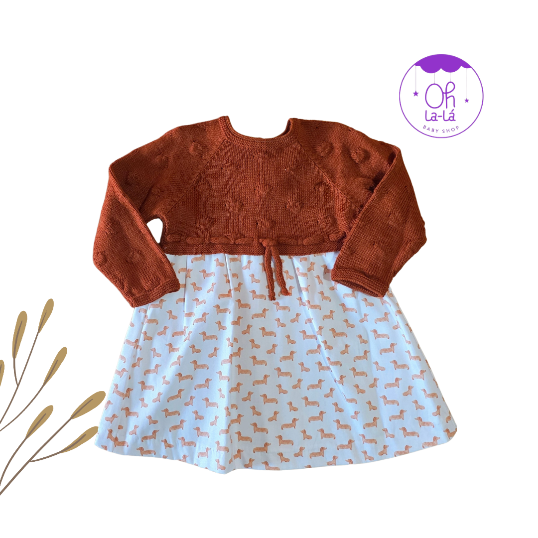 Un vestido adorable y cálido, perfecto para la temporada. La parte superior está confeccionada en punto de lana de color teja (o calabaza/óxido), con un detalle calado. La falda, sobre fondo blanco, presenta un tierno estampado de perros salchicha (dachshund). Viene con un lazito en la cintura para ajustar.